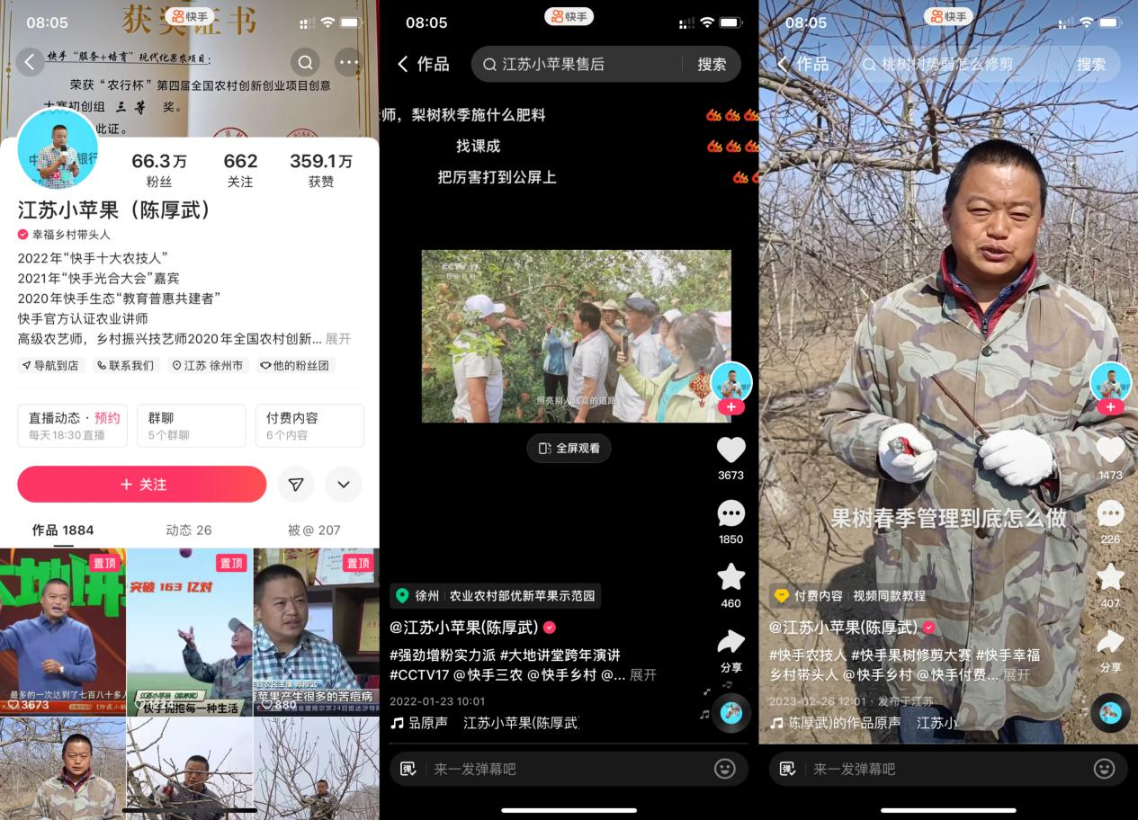 经营着13亩苹果园,给十几个小型农场做技术指导的陈厚武,每天在快手上通过@江苏小苹果 这个账号教大家种苹果,因为讲解专业、细致,深受农民喜爱,其粉丝遍布新疆阿克苏、西藏林芝、云南昭通、贵州六盘水等偏远地区。