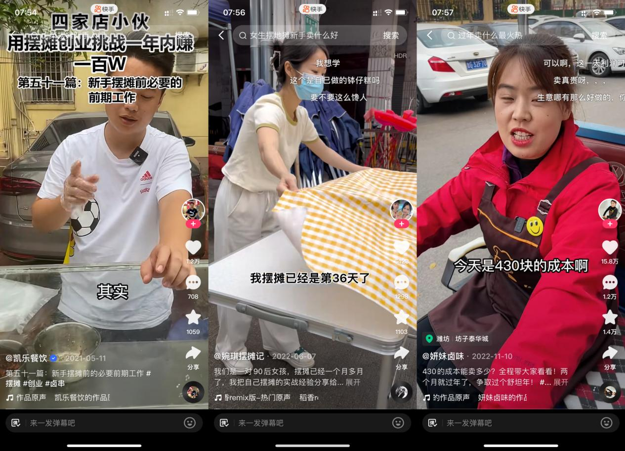 以“摆摊创业”为例,打开快手,不仅有实战经验分享、新人摆摊注意事项、懒人摆摊的40种新产品,在快手课堂上,围绕摊位选址、logo设计、获客引流等全链路,还有诸多深度教程,让小本创业的普通人也能拥有“最强大脑”。