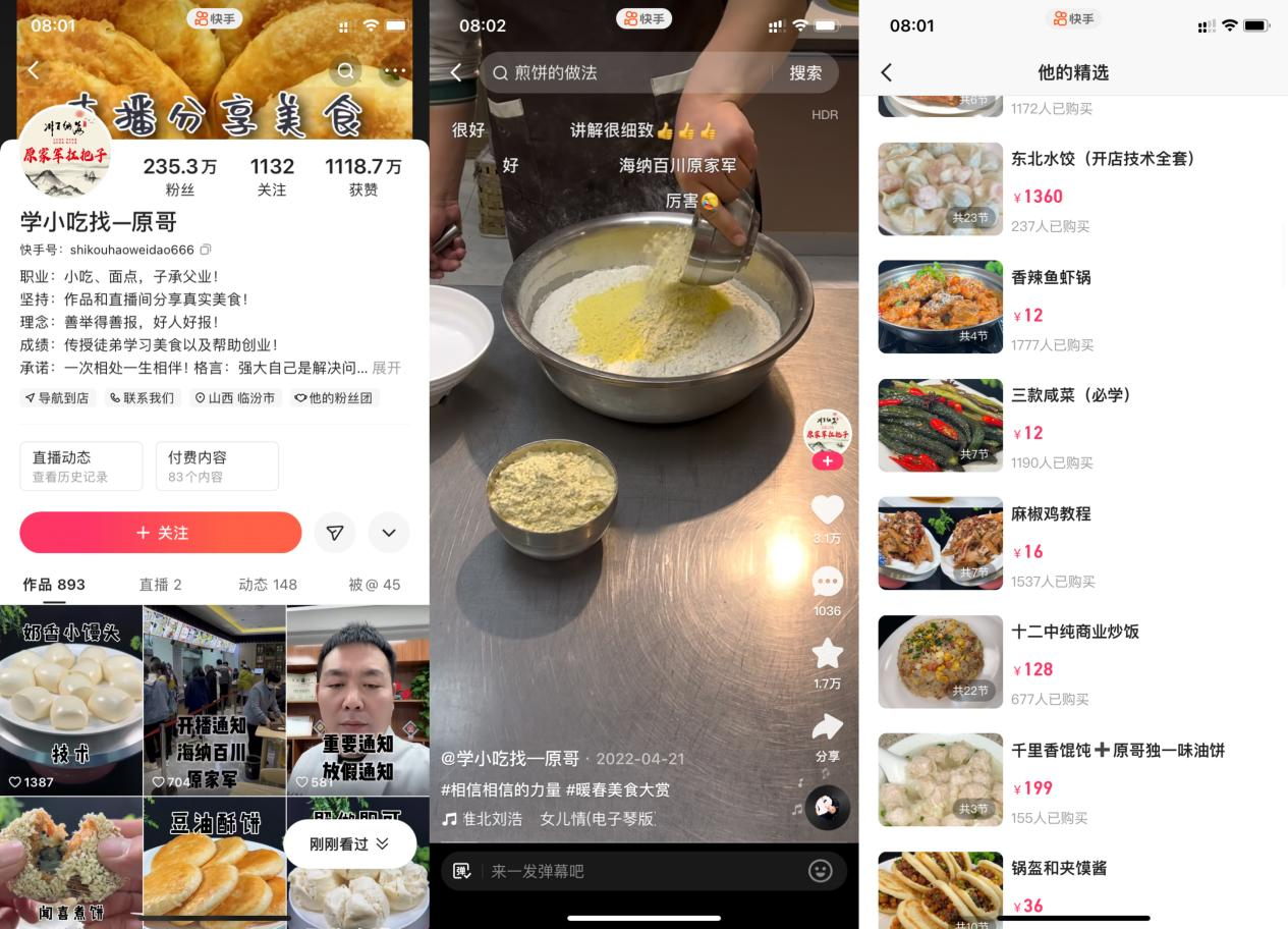 在快手上,聚焦小成本餐饮创业的内容还有很多,传授爆款小吃技术的@比尔 盖南、专注面点制作的@丰哥九尊小吃分享、对东北菜系颇有研究的@闫妈妈街边小吃 等等。