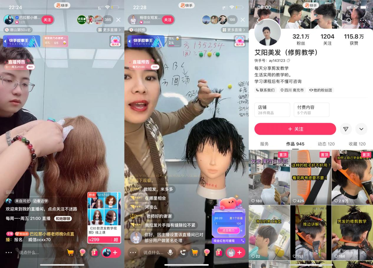 每晚9点,巴拉那小娜老师都会在快手开启直播,围绕发型剪裁、染发烫发等美发基本功进行手把手教学;同为美发教学类账号,@艾阳美发(修剪教学)则更侧重男士发型的修剪以及烫染;@杨琼女短发设计 则另辟蹊径,聚焦短发设计开展专业教学。