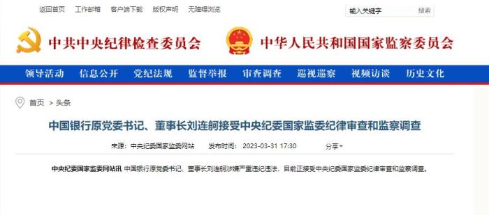 据中央纪委国家监委网站3月31日消息,中国银行原党委书记、董事长刘连舸涉嫌严重违纪违法,目前正接受中央纪委国家监委纪律审查和监察调查。