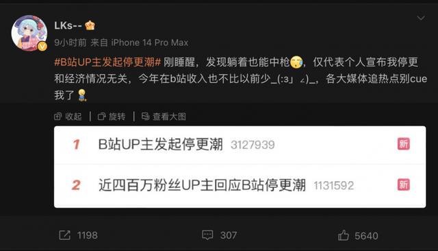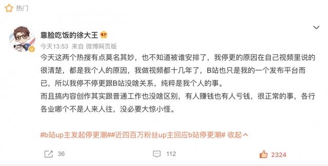 文章发布后,相关话题迅速在网络上引发热议,并一度冲上微博热搜第一位。不过,文中提到的两位百万级别的UP主随后发布微博并不认同这种说法。“LKs--”称,“仅代表个人宣布我停更和经济情况无关,今年在b站收入也不比以前少。”“靠脸吃饭的徐大王”对自己上热搜则表示莫名其妙,他称,“我停更的原因在自己视频里说的很清楚,都是我个人的原因,我做视频都十几年了,B站也只是我的一个发布平台而已,所以我停不停更跟B站没啥关系,纯粹是我个人的事。而且搞内容创作其实跟普通工作也没啥区别,有人赚钱也有人亏钱,很正常的事,各行各业哪个不是人来人往,没必要大惊小怪。“