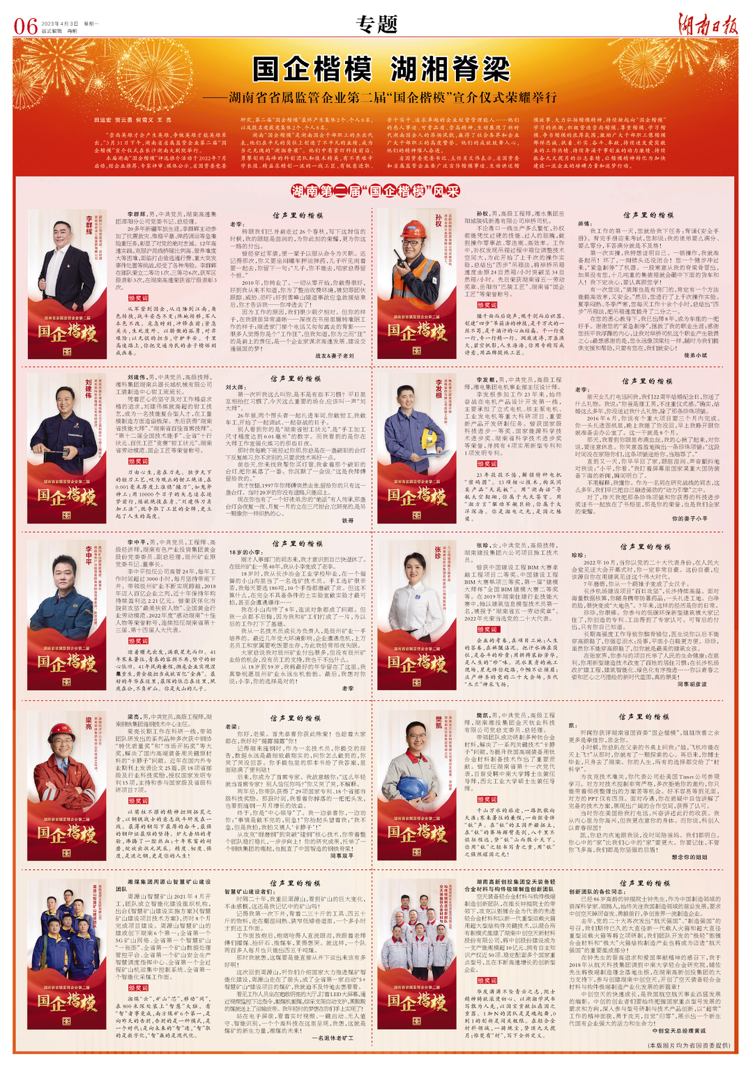 湖南“国企楷模”是湖南国企干部职工的杰出代表,他们在平凡的岗位上创造了不平凡的业绩,成为当之无愧的“湖湘脊梁”。他们中有紧盯科技前沿、勇攀创新高峰的科创团队和技术精英,有不畏艰辛学长技、精益求精创一流的一线工匠,有锐意进取、苦干实干、追求卓越的企业经营管理能人……他们的感人事迹、可贵品质、崇高精神,生动展现了新时代湖南国企人的昂扬风貌,赢得了社会各界和企业广大干部职工的高度赞誉。他们的成就鼓舞人心,他们的精神催人奋进。