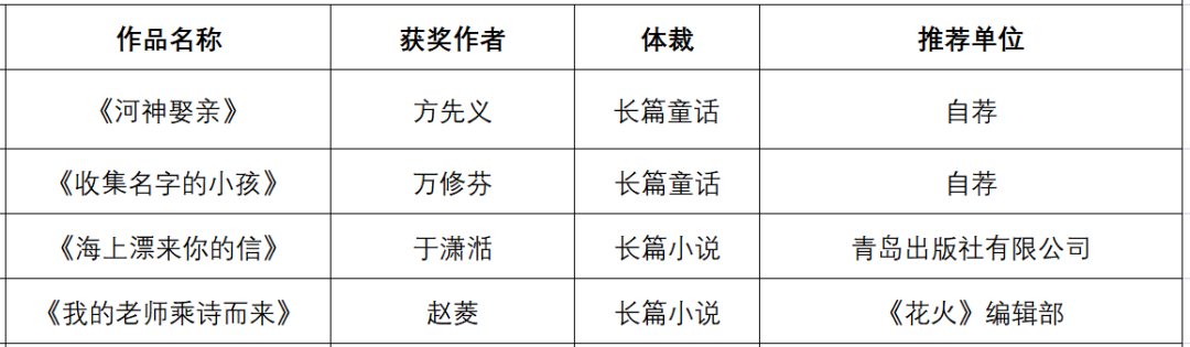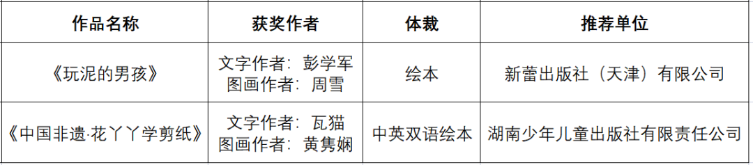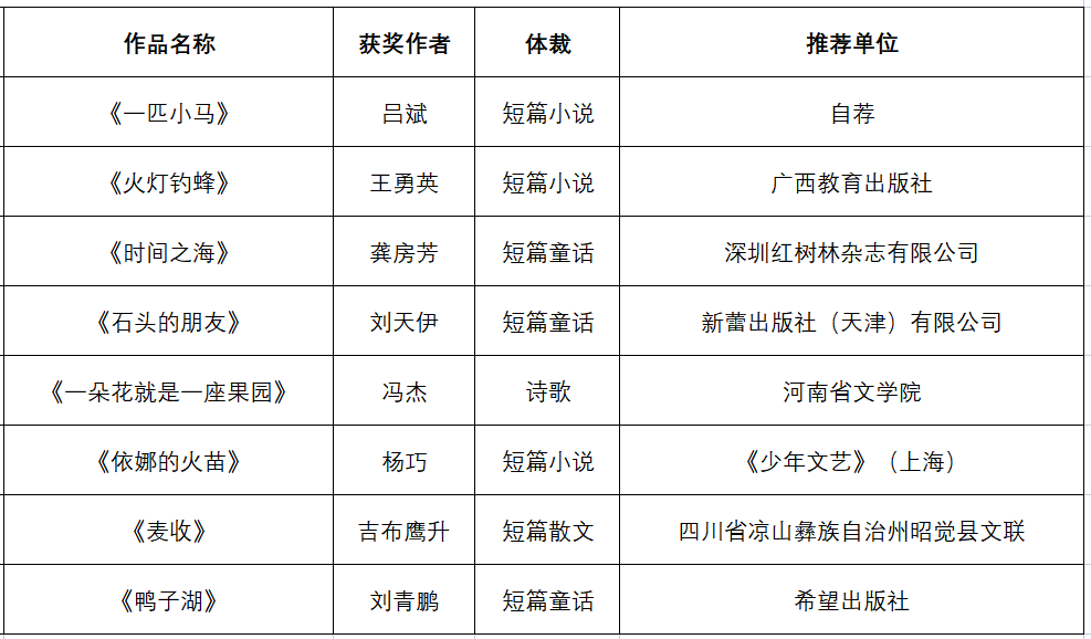 湖南日报·新湖南客户端4月3日讯(记者 廖慧文)4月2日,第五届张天翼儿童文学奖获奖名单正式公布。《从前有一个故事》《游泳》《翡翠地》等21部(篇)作品获奖,《河神娶亲》《收集名字的小孩》获8部(篇)作品获提名奖作品。李彩红、谢淼焱获新人奖,李小菁、张雨荷获新人提名奖。