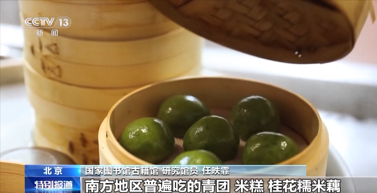国家图书馆古籍馆研究馆员 任昳霏:现在知道清明节吃得最多的,大家最熟悉的就是南方地区普遍吃的青团、米糕、桂花糯米藕这一类糯叽叽的食物,它凉的时候也是软了,而且香糯可口。