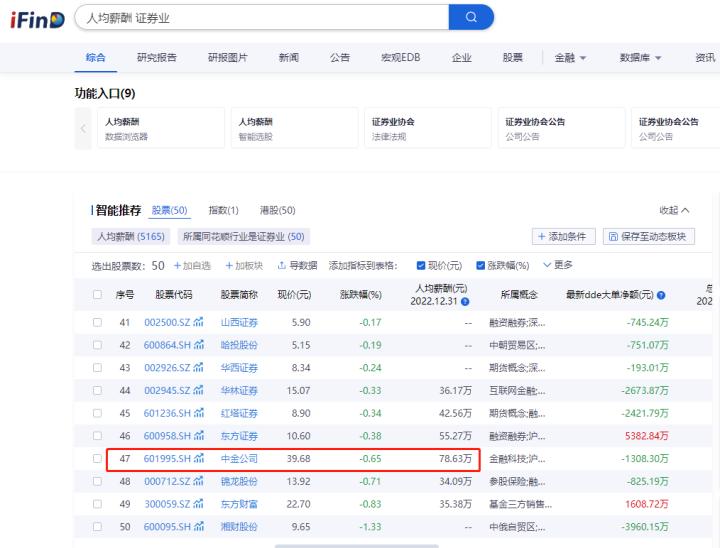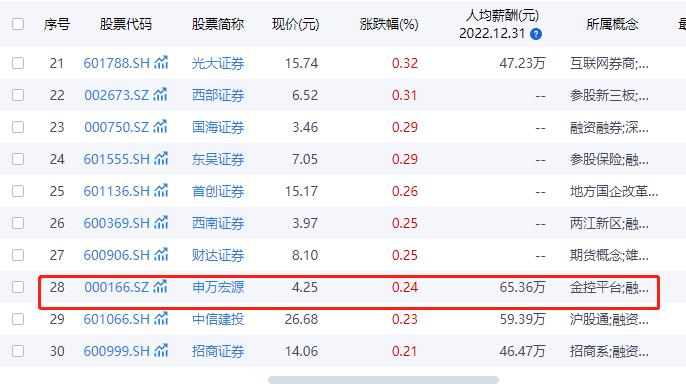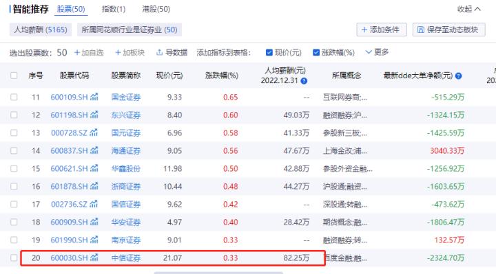 目前,中信证券以82.25万元的员工平均薪酬,超过中金公司暂时排在券商行业首位,薪酬比上年同期下降近8%。2022年度,中信证券净利同比下降7.72%,员工平均薪酬降幅与净利降幅相当。