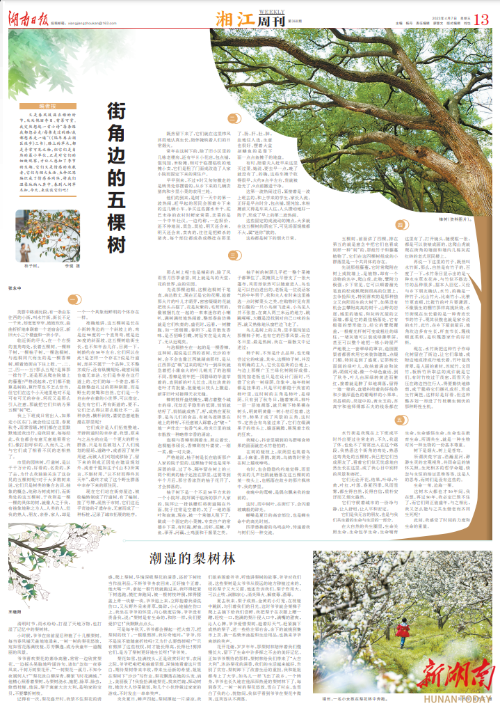 临近街的尽头,在一个右拐的直角弯处,长着五棵树。一棵柿子树,一棵柚子树,一棵泡桐树。与泡桐同穴而生的是一棵香樟树。顺着坡街由下往上数,一、二、三、四……五?那么五呢?是算那一排竹子,还是那丛爬在院墙上的藤蔓?严格说起来,它们都不能算是树的,算作草也不怎么恰当,但它们在这个小天地里绝对不是可有可无的存在,何况又是那么引人注意。那就把它们归纳为第五棵“树”吧。