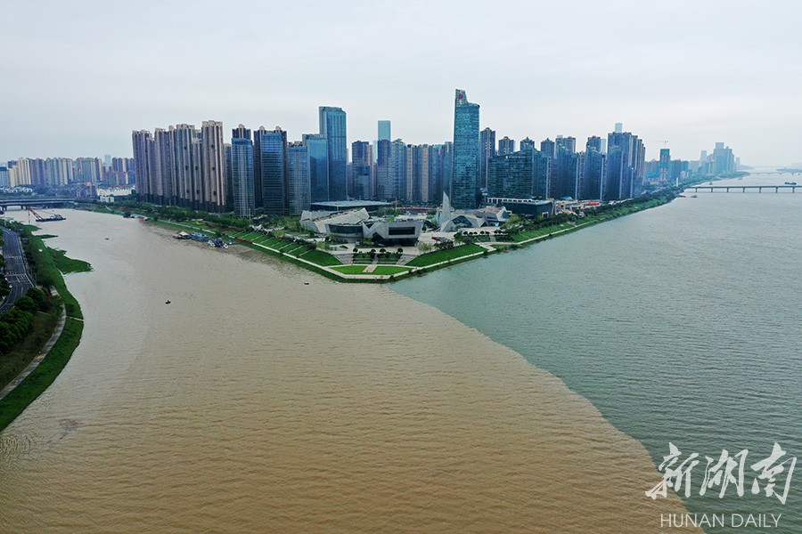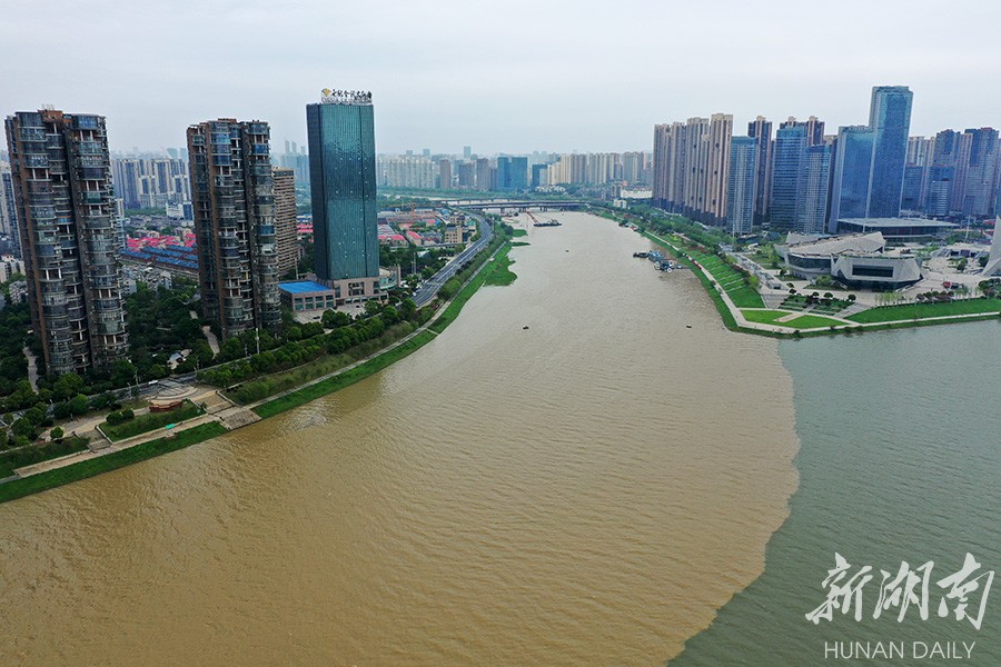 4月5日,长沙市浏阳河与湘江交汇处,黄色的浏阳河水与清澈的湘江水形成了一条明显的“分界线”。近日来,受上游降水影响,造成泥沙冲入浏阳河中,使河水混浊。而湘江水目前清澈,故在江、河交汇处出现“泾渭分明”独特景观。 湖南日报全媒体记者 田超 摄