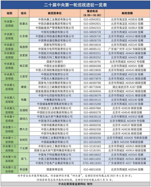 月9日,据央视新闻消息,经党中央批准,二十届中央第一轮巡视将对30家中管企业、5家金融单位和国家体育总局开展巡视工作。目前,15位中央巡视组长已经全部亮相。根据官方披露,第一至第十五巡视组的组长名单如下: