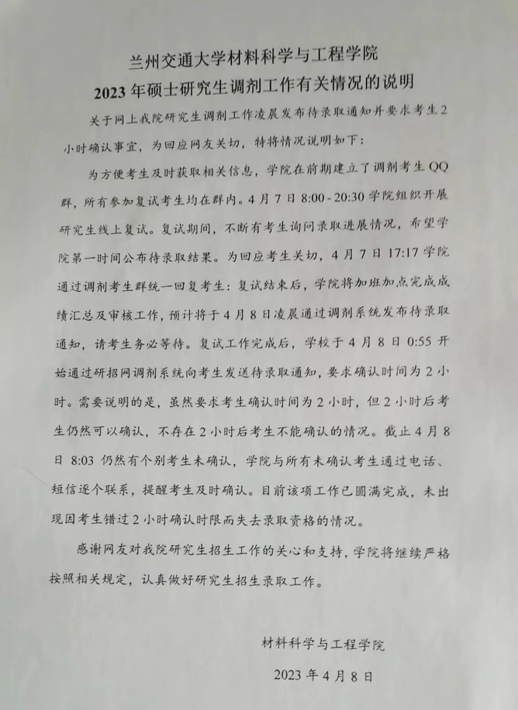 此外,针对“研招待录取通知要在2小时内确认”的网传消息,记者注意到,4月8日,兰州交通大学校材料科学与工程学院已发布情况说明。