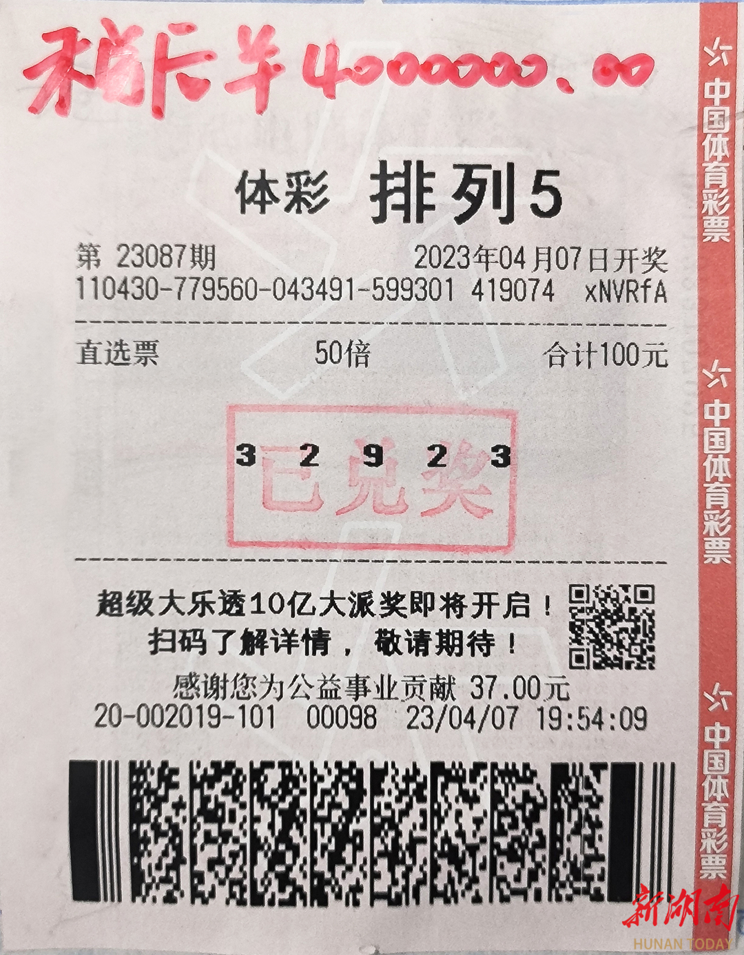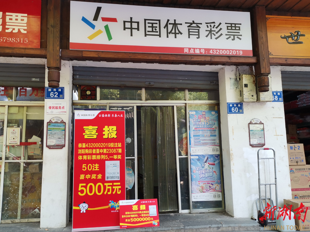 4月7日晚,排列5游戏第23087期开出奖号“32923”,浏阳市嗣同路60号4320002019体彩投注站传出喜讯,该站喜中50注一等奖,单注奖金10万元,总奖金500万元。