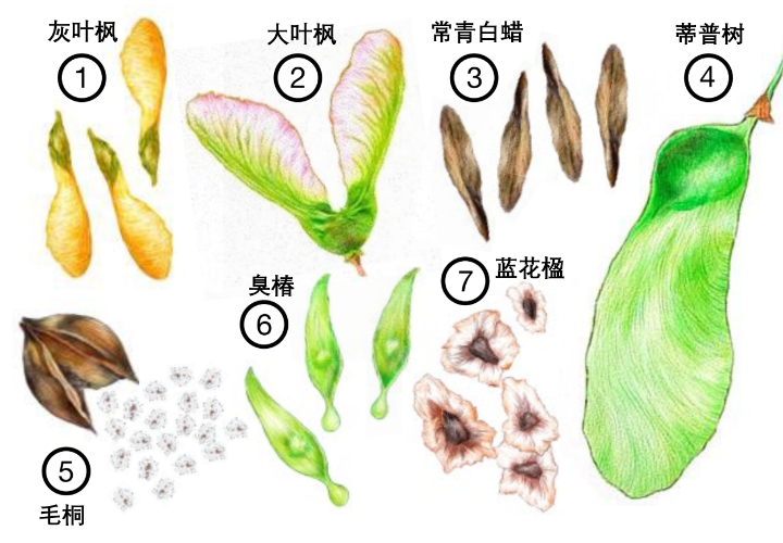 大自然孕育出了无数神奇的植物,它们中有的进化出了类似于螺旋桨形状的种子(如下图中的 ①②③④)或者扑翼 / 盘状的种子(如下图中的 ⑤⑥⑦)。
