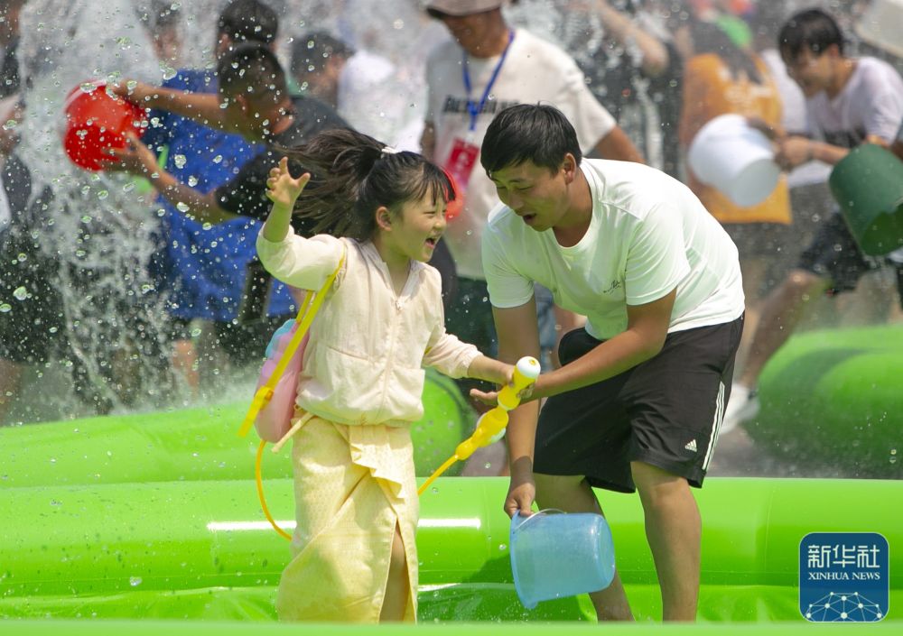 当日,云南省德宏傣族景颇族自治州芒市2023年泼水狂欢节开幕,人们相互泼洒代表幸福、吉祥的清水,表达着相互间的无限祝福。