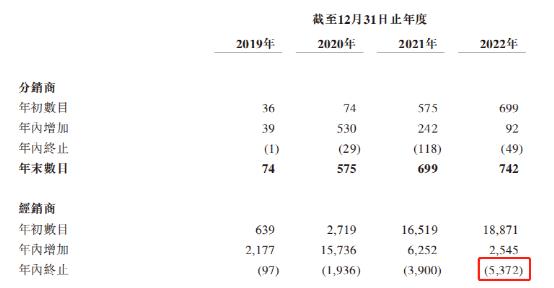 招股书显示,2018年、2019年、2020年及2021年,公司的分销网络分别由36名、74名、575名及699名分销商以及639名、2719名、16519名及18871名经销商组成。而截至2022年12月31日,公司分销网络包括742名分销商及16044名经销商。不难发现,公司的分销商和经销商极不稳定,波动非常大。2022年来看,增加了2545个经销商,但减少了5372个,净减少2800余个。