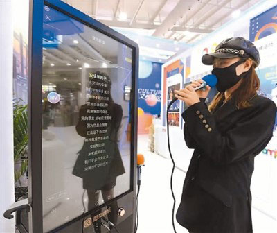 在北京举行的中国国际服务贸易交易会首钢园展区文旅服务展馆内,观众体验K歌一体机。新华社记者 任超 摄