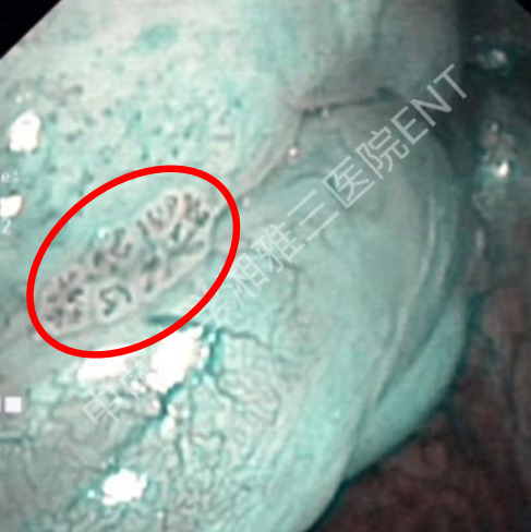 (窄带成像内镜下喉部肿瘤血管呈棕褐色形态、呈蝌蚪或蚯蚓状)