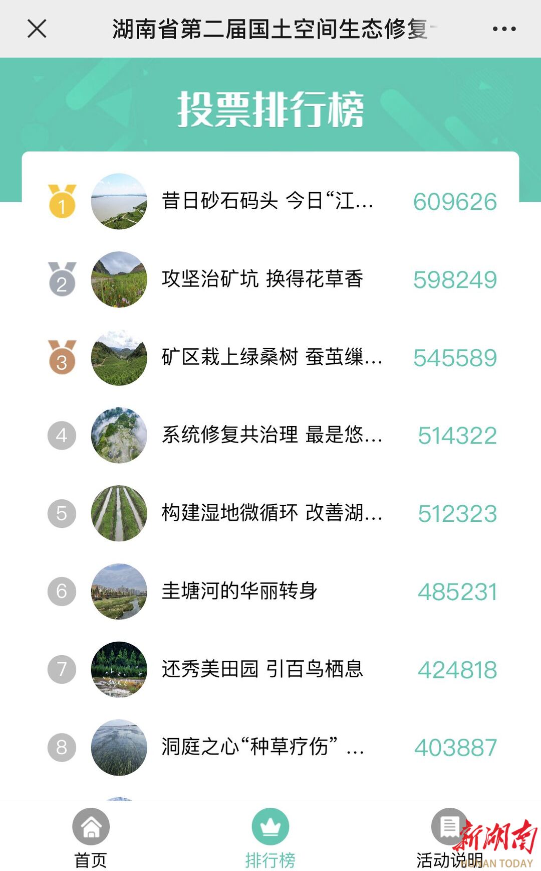 “昔日砂石码头,今日江豚家园——岳阳市君山区华龙码头生态修复范例”票数最高,达60.9万票,排名第一;排名第二的是“攻坚治矿坑,换得花草香——常德市鼎城区石板滩石煤矿区生态修复范例”,票数为59.8万票;排名第三的是“矿区栽上绿桑树,蚕茧缫出振兴路——湘西州花垣县矿业生态修复范例”,获54.5万票。