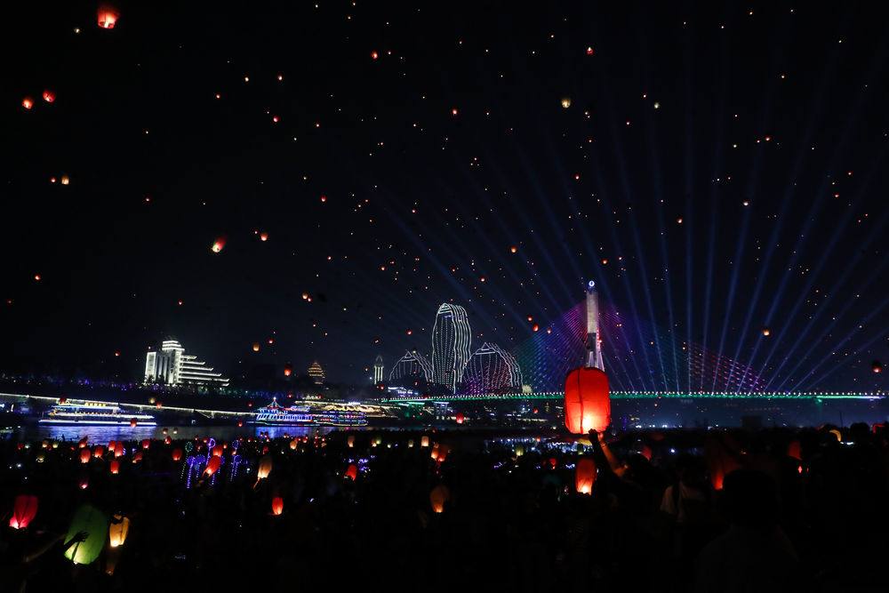 ↑4月13日,人们在中国云南省西双版纳傣族自治州燃放孔明灯,庆祝泼水节。