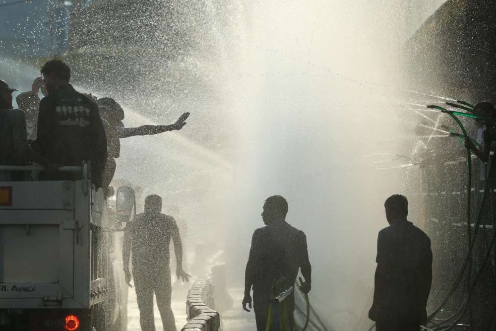 ↑4月13日,人们在泰国曼谷庆祝宋干节。每年4月13日至15日是泰国传统新年宋干节,人们会以互相泼水的方式表达迎新祝福。