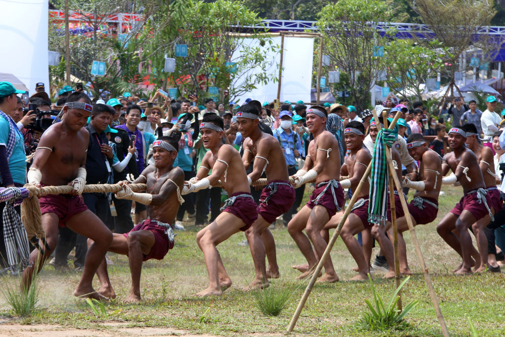 ↑4月14日,在柬埔寨暹粒吴哥古迹内,人们在宋干节庆祝活动上参与传统拔河游戏。