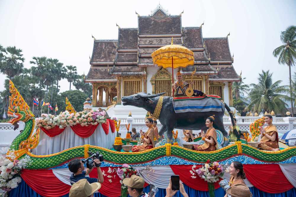 ↑ 4月16日,宋干小姐在老挝琅勃拉邦参加宋干节庆祝活动。老挝古都琅勃拉邦在节日期间举行宋干小姐的巡游活动,7名由选美产生的宋干小姐坐上花车巡游古城。