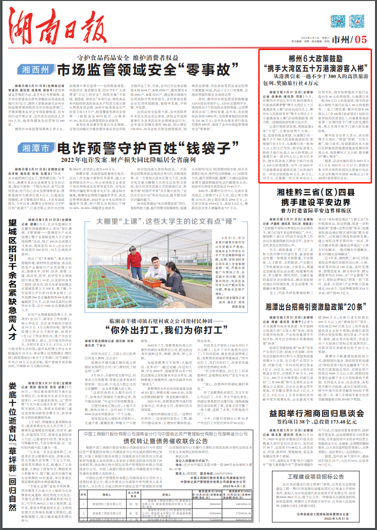 郴州有关负责人表示,该市将携手大湾区、“拼盘”营销,“引客入郴”、助力旅发,也诚邀国内各大旅行社积极组团港澳同胞游览郴州奇美山水、体验郴州人文古韵、感受郴州“郴心服务”。
