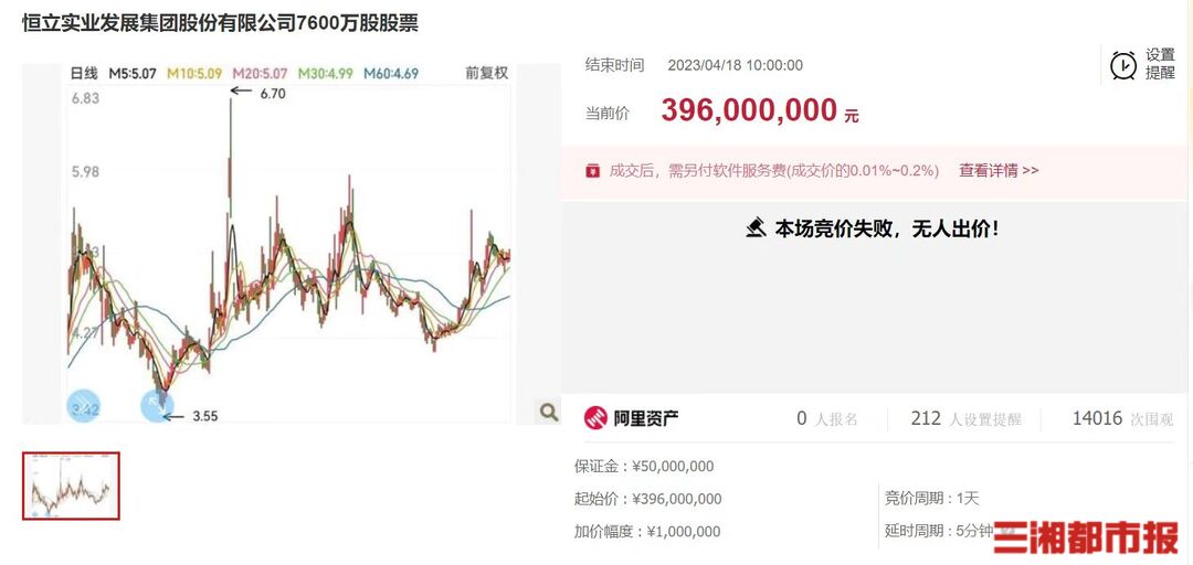 三湘都市报·新湖南客户端4月18日讯(全媒体记者 潘显璇)4月17日10时起至18日10时,湘股恒立实业的7600万股股票在淘宝网资产竞价网络平台公开拍卖,起拍价格为3.96亿元。截至拍卖结束,因无人出价,这笔股票最终流拍,这也是其第二次出现流拍。