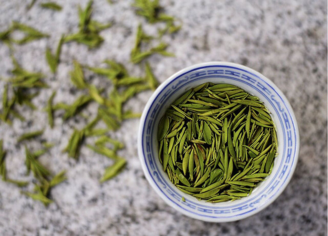 即指君山银针,产于湖南岳阳洞庭湖中的君山,形细如针,故而得名。