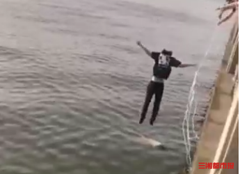 略懂一点水性的贺益没来得及脱掉衣服,翻越护栏跳入江中,迅速游到女子身边,将其身体翻过来。看上去平静的江水暗流涌动,贺益半托着女子奋力游着,但水面距离平台有近3米高,无法上岸。