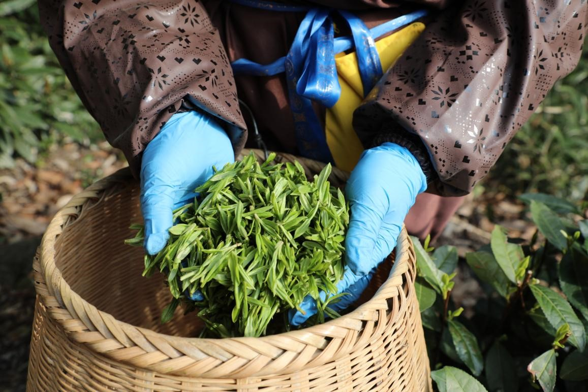 采茶工展示刚刚采摘的西湖龙井明前茶。人民网 方彭依梦摄