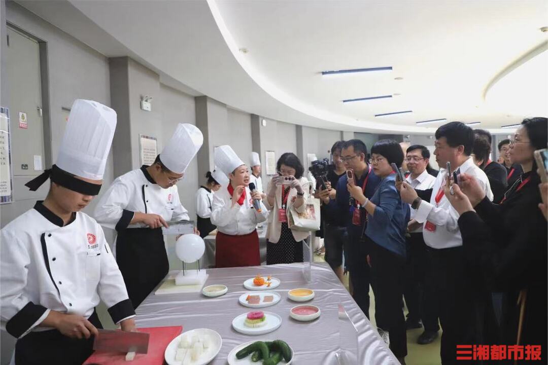 来自长沙商贸旅游职院湘菜学院的师生们献上了一场舌尖上的视觉盛宴。融合阅读活动主题,师生们用青萝卜和冬瓜创造了“舌尖上的清廉”食雕,还在食材内巧妙地嵌入灯光,让整个作品熠熠生辉。学生自主设计的湘菜商务宴席则在传承湘菜经典的基础上进行创新,既不失传统风味又别具雅致造型。还有学生现场进行蒙眼花刀、气球切肉、西点技能等展示,更是引来无数惊叹。同学们表示:“厨艺的学习需要我们能静心、有耐心、具恒心,而阅读不仅带给我们更宽的眼界、对专业知识更深入地理解,也培养了我们宁心静气的行为习惯。”