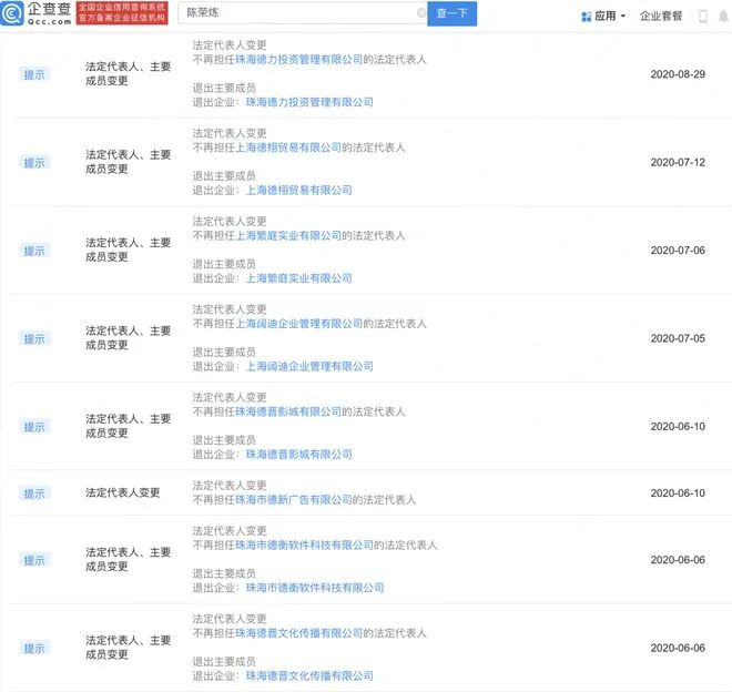 值得一提的是,2020年5月至8月,陈荣炼相继退出内地多家公司法定代表人及高管职位,包括珠海德晋文化传播有限公司、珠海市德新广告有限公司、上海德栩贸易有限公司等。