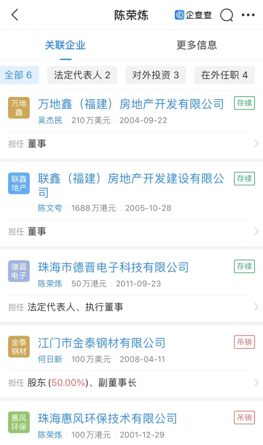 此外,据企查查APP显示,陈荣炼在内地共关联5家公司,其中3家为存续状态,包括联鑫(福建)房地产开发建设有限公司、万地鑫(福建)房地产开发有限公司、珠海市德晋电子科技有限公司,陈荣炼担任董事、执行董事等职位。陈荣炼同时还担任珠海市德晋电子科技有限公司法定代表人,该公司系德晋集团有限公司全资子公司。