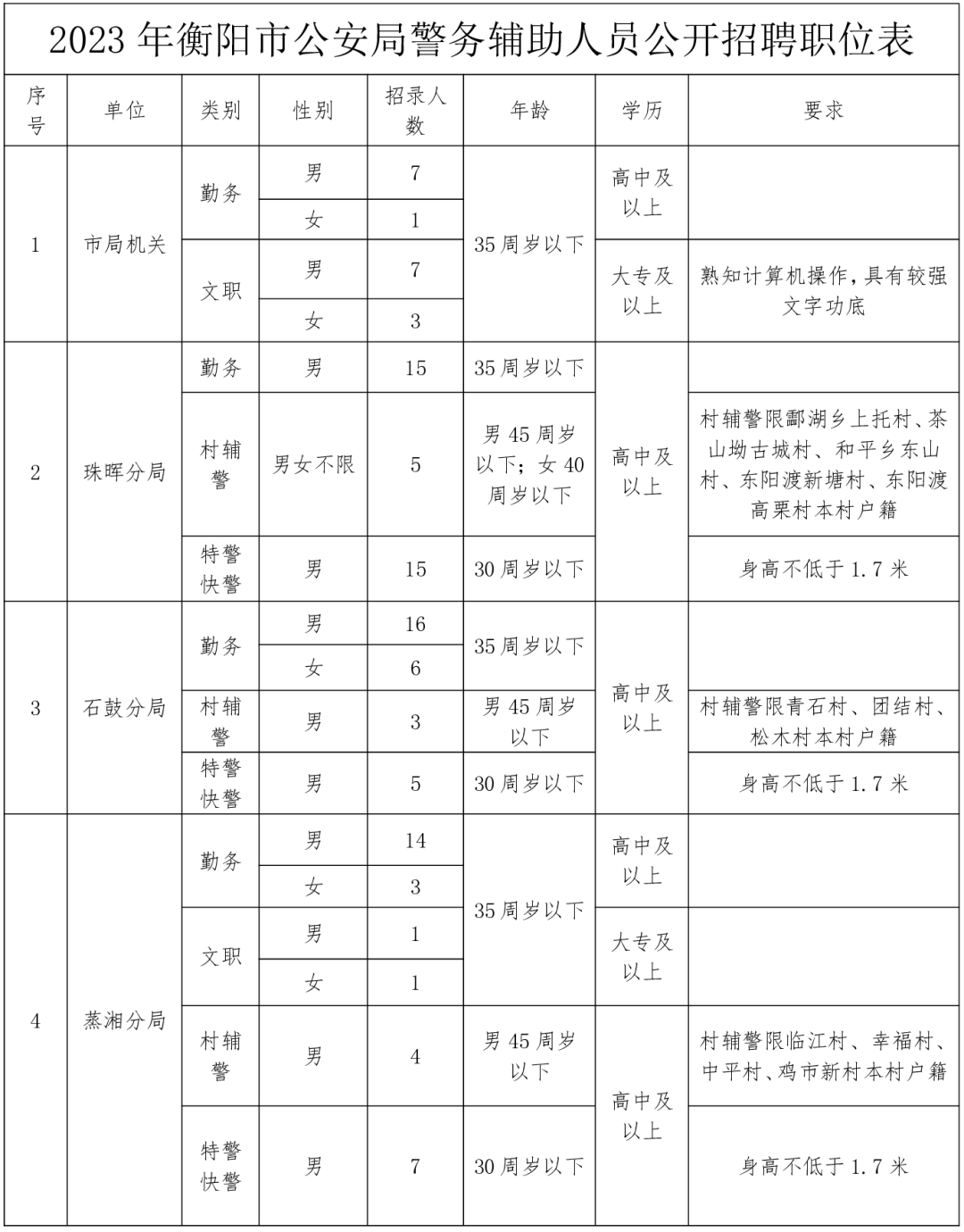 衡阳市公安局共计划招聘警务辅助人员200名。具体招聘职位、人数、资格条件等详见《2023年衡阳市公安局警务辅助人员公开招聘职位表》。