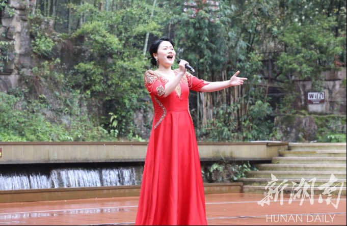 湖南日报·新湖南客户端4月5日讯(通讯员 董明勤)4月5日下午,一场精彩纷呈的“草原与峰林对话音乐会”在张家界宝峰湖景区山水舞台浓情上演。蒙古族、苗族、维吾尔族、土家族等多位知名民歌传承人依次上台献唱本民族特色民歌,蒙古族舞蹈及乐器表演、土家族打溜子将现场气氛一次次推向高潮,让现场的游客朋友们叹为观止。