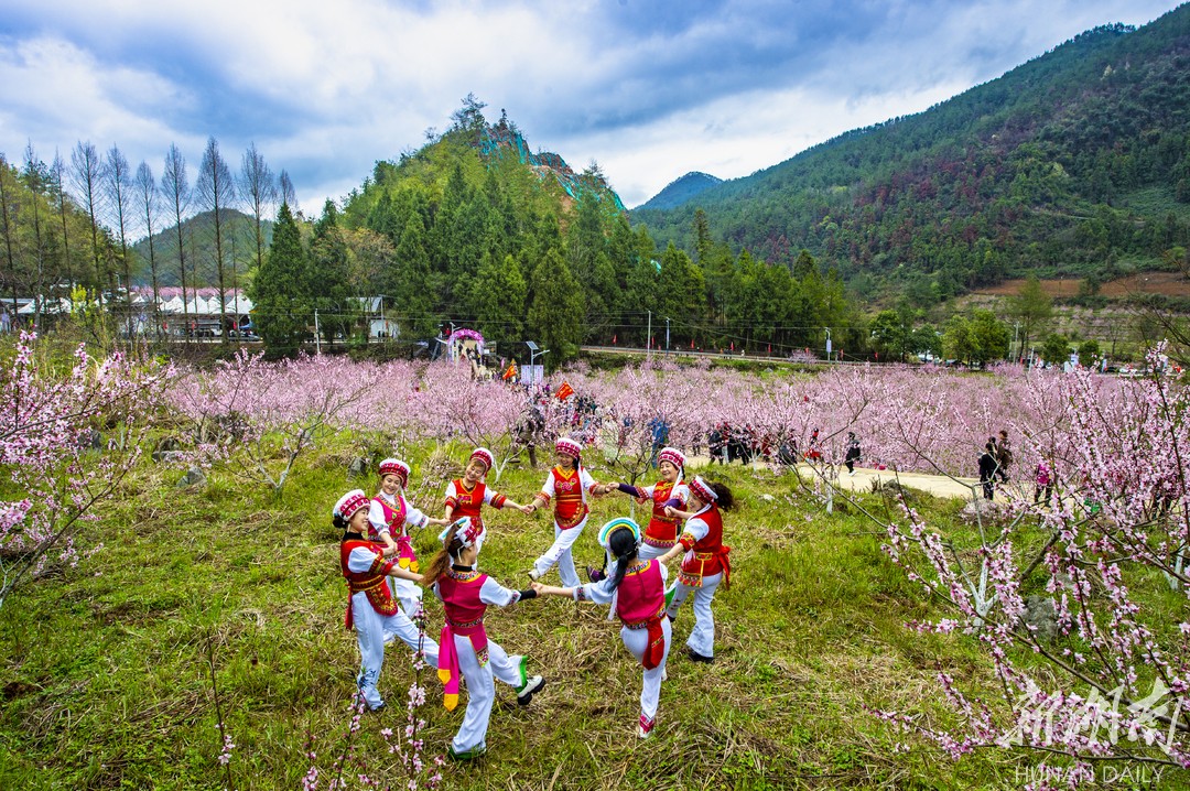 艺术节开幕式正在有序进行,我却中途溜号遁入桃林,去找同行的伙伴。人山人海中难觅踪影,只好一个人独自按图索骥往约定的地方走。桃园里,人头攒动,眼花缭乱:白族少女翩翩起舞,桑植民歌响遏行云,团结鼓舞节奏明快,杖鼓舞粗犷大方,九子鞭舞姿活泼,旗袍走秀带着浓浓中国风。还可品尝纯正的白族三道茶,把农家腊肉、桑植白茶、白族扎染、野生葛粉等当地土特产带回家。花为媒,文作魂,产业和文化深度融合,擦亮了白族村寨的文化底色,提升了美丽乡村的名气境界。