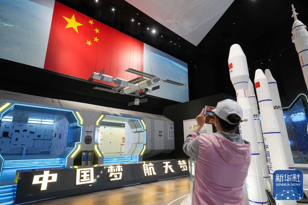 ↑4月24日,观众在中国航天博物馆拍摄展出的空间站模型。