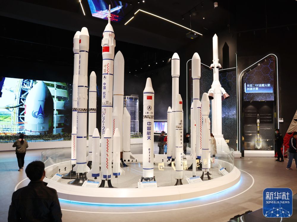 ↑4月24日,观众在参观展出的长征系列运载火箭模型。