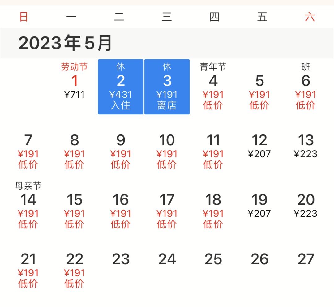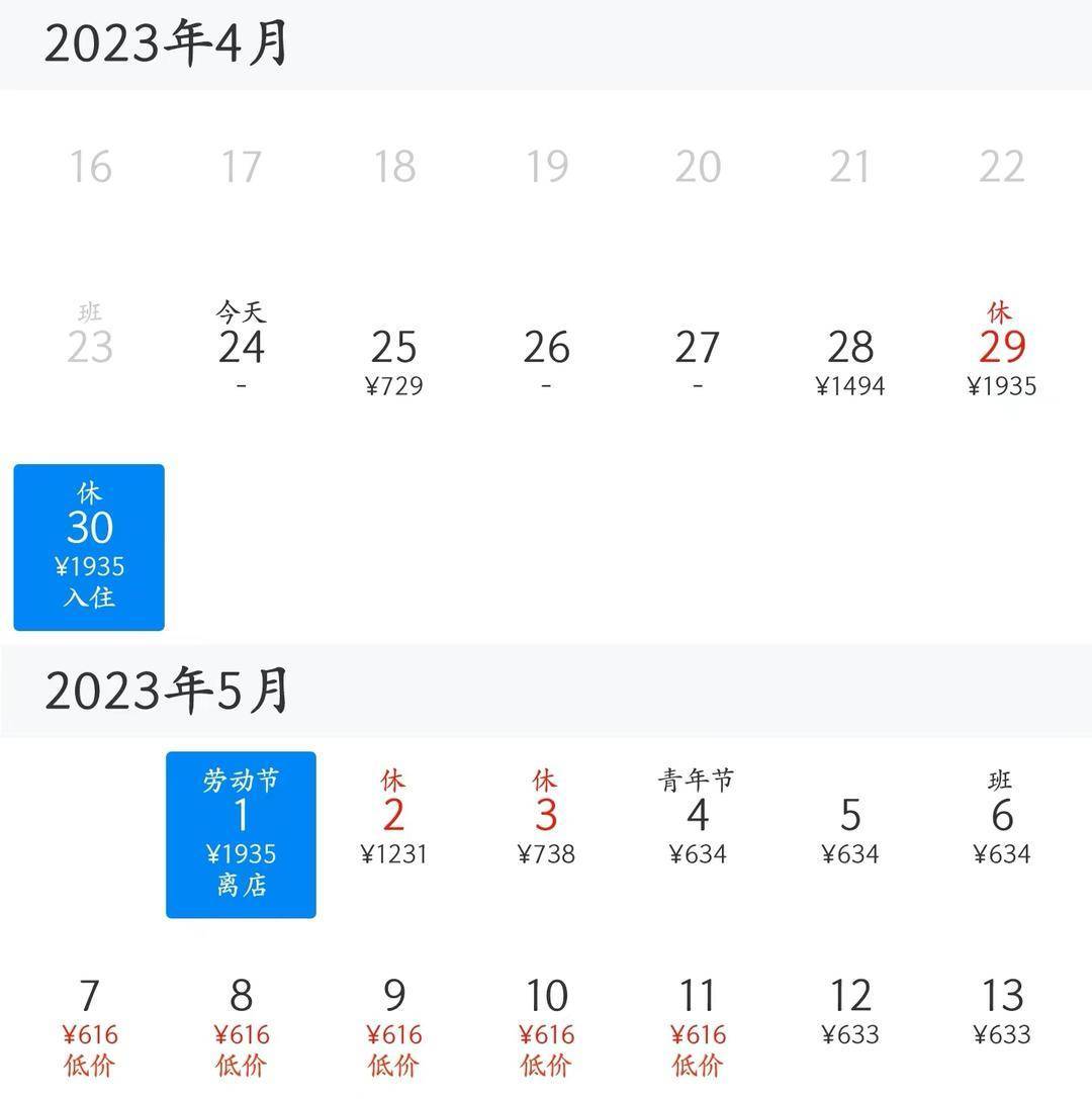 记者4月24日搜索预订平台发现,苏州的一家快捷酒店,平时的报价是191元/晚,5月2日报价是431元,5月1日则是711元。西安的一家星级酒店,平时的报价是六七百元/晚,4月28日是1494元,4月29日-5月1日是1935元/晚。