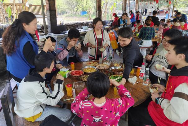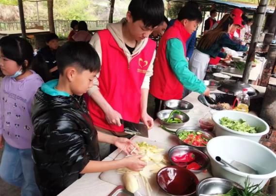 “阿姨,土豆这么切成片可以吗”“叔叔,我来烧火吧,在家里都是我帮奶奶烧火做饭的”“阿姨,今天我炒一个家常豆腐,等下你尝尝我的厨艺”……在社工的组织下,困境儿童和雷锋青少年分成4个小组各自大展厨艺,现场一片欢乐景象。在志愿者的指导下,历经2个小时,各式各样的菜肴在孩子们辛勤忙碌中摆上桌,大家欢聚一堂品尝美味佳肴。