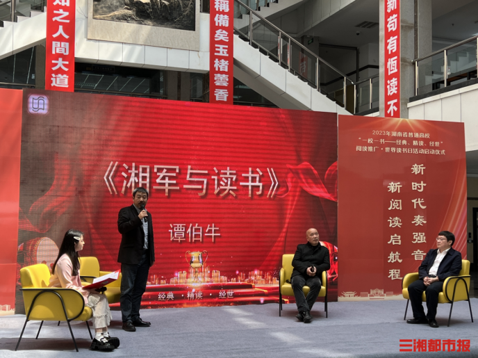 三湘都市报·新湖南客户端4月26日讯(全媒体记者 刘镇东 黄京 余蓉)从书院士人的读书生活到“一部近代史,半部湖南书”,再到以阅读见证近现代中国社会的风云巨变……今日,湖南大学岳麓书院院长肖永明教授,清代史专家谭伯牛,路遥文学奖获得者、著名作家何顿等3位名家,在湖南科技大学与大学生面对面,分享阅读经验。这是湖南省普通高校2023年“一校一书—经典、精读、经世”阅读推广•世界读书日活动之一。