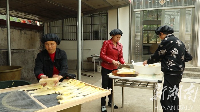 洪塘营瑶族乡森林覆盖率高、土壤肥沃,长出来的笋笋体肥大、美味爽口,深受民众喜爱。为了更好地保存并享用大自然的馈赠,瑶源合作社沿袭笋干加工传统技艺,将新鲜的竹笋制成笋干。在合作社里,工作人员正把收来的春笋用水洗净,放入锅中焯水,最后用流动水浸泡,去除竹笋里的苦味和涩味。在浸泡八小时以后,把笋捞出,沥干水分,用刀切开摆放在烘干网上,放入烘干机内,利用热量把笋烘干,等到笋片的水分蒸发到一定程度就可以收集起来了。