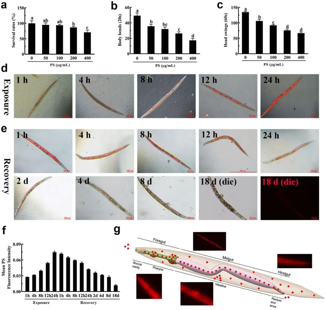 实验结果与长时间相似,随着纳米塑料浓度的增加,线虫表现出存活率降低和运动行为显著减弱 (图2a-c)。并且,随着暴露时间的延长,纳米塑料在蠕虫体内的吸收和积累也增强。