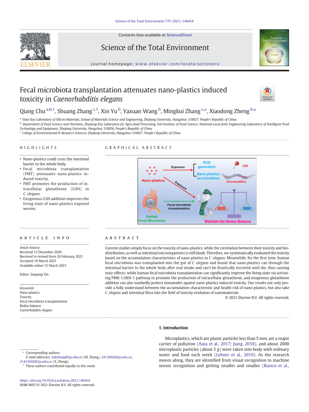 近期,一篇论文以线虫为研究对象,对纳米塑料的分布、转移、蓄积和毒性进行了系统评价,并首次应用线虫作为FMT的模型进行了创新性探索: