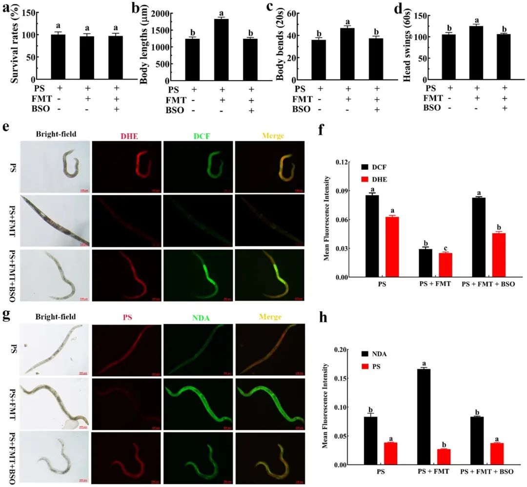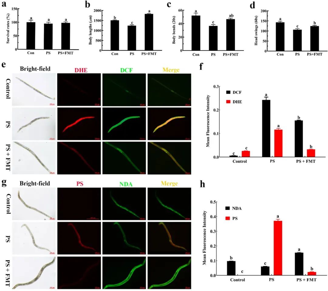 结果显示,FMT和纳米塑料组的存活率均未明显下降 (图4a)。不过,纳米塑料显著抑制了线虫的身体长度和运动行为,而FMT逆转了这种下降趋势 (图4b-d)。
