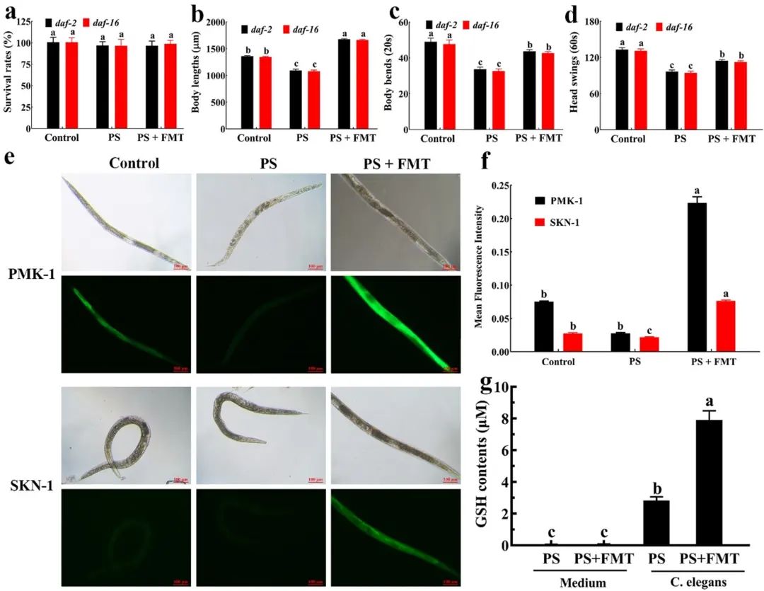 在秀丽隐杆线虫中,daf-2和daf-16基因通常被认为是氧化应激和衰老期间最重要的转录因子,而实验发现,对于基因有daf-2和daf-16的突变体线虫,FMT仍可以减轻纳米塑料诱导的毒性。