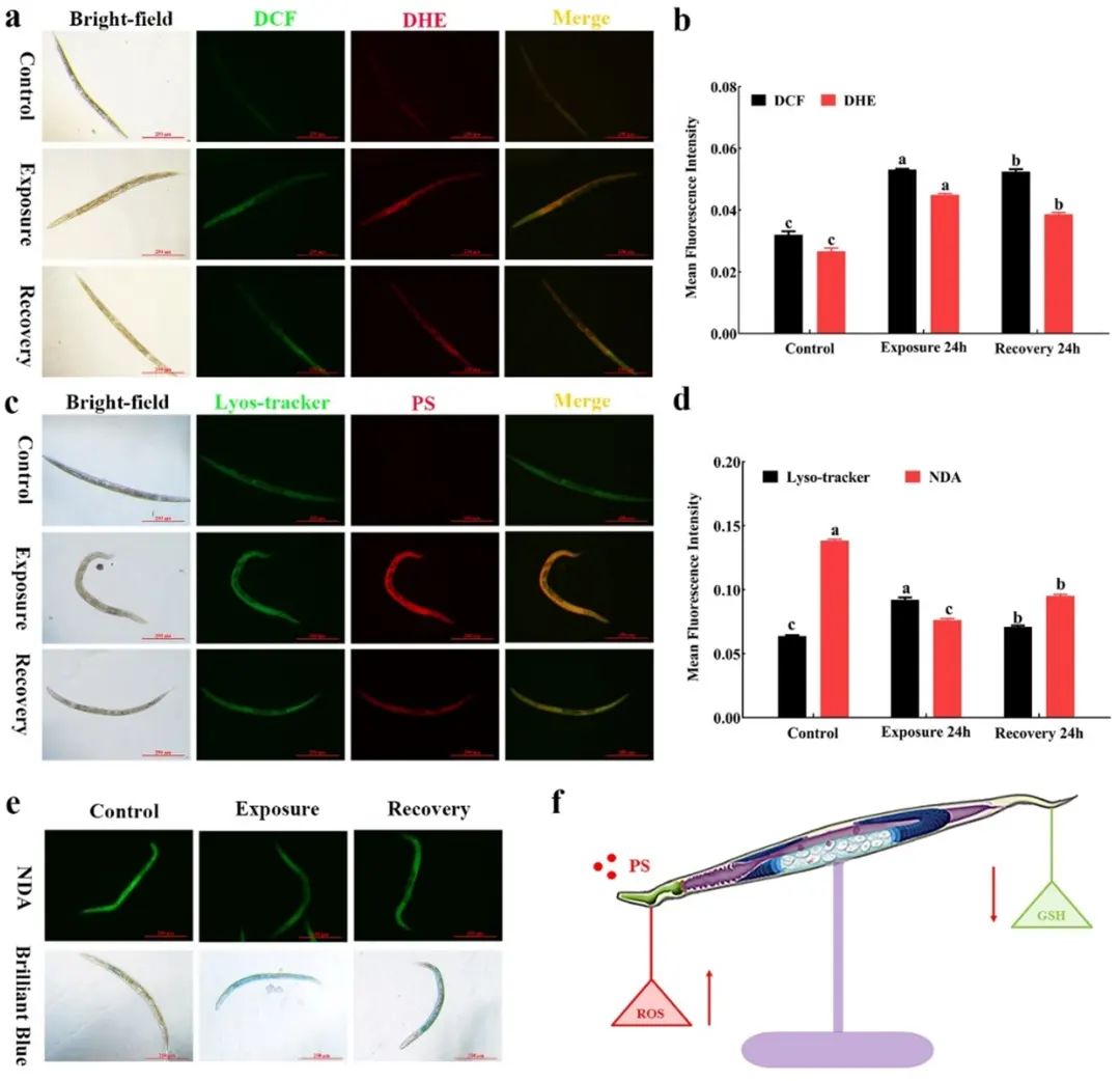 结果发现,纳米塑料使得线虫的活性氧 (ROS) 和氧离子 (O2-) 的积累增加,转移至正常状态24小时后,线虫的氧化应激得到了适度恢复 (图3a);而在暴露后,纳米塑料和溶酶体的共定位 (图3c中的黄色荧光) 增强了,转移至正常状态后减少。