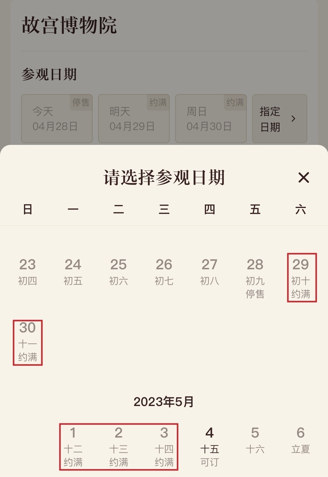 故宫博物院、侵华日军南京大屠杀遇难同胞纪念馆、南京博物院、陕西历史博物馆4月29日至5月3日的门票已经约满。
