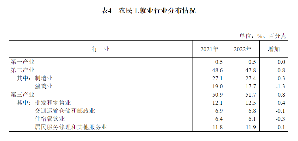 分产业看,99.5%的农民工从事二、三产业。其中,从事第三产业的农民工比重为51.7%,比上年提高0.8个百分点;从事第二产业的农民工比重为47.8%,比上年下降0.8个百分点。