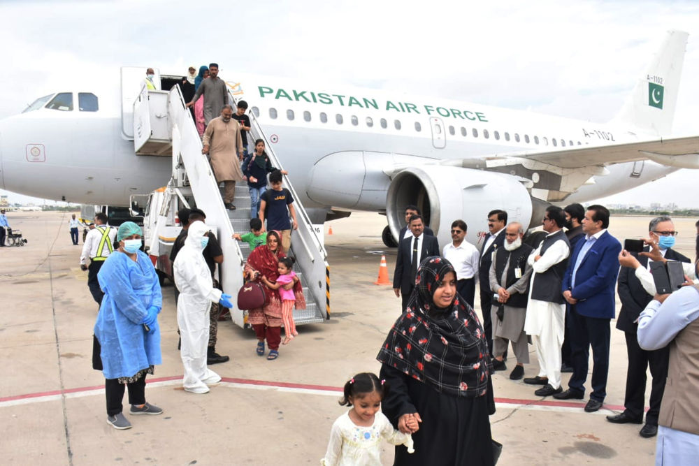 ↑4月28日,从苏丹撤离的巴基斯坦公民抵达巴基斯坦卡拉奇的一座机场。新华社发(巴基斯坦媒体信息部供图)